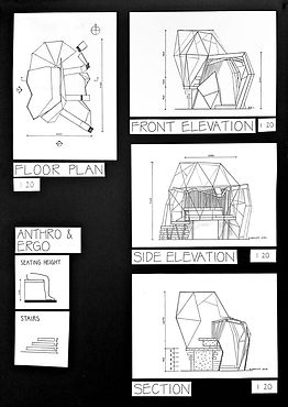 By revisiting our models made in Project 1, we had to design a series of Sensorial Spaces within 30m³, making use of design principles, structure, materiality, anthropometry, ergonomics and architectural narratives. Then, we had to present our structure via drawings and presentation boards.
